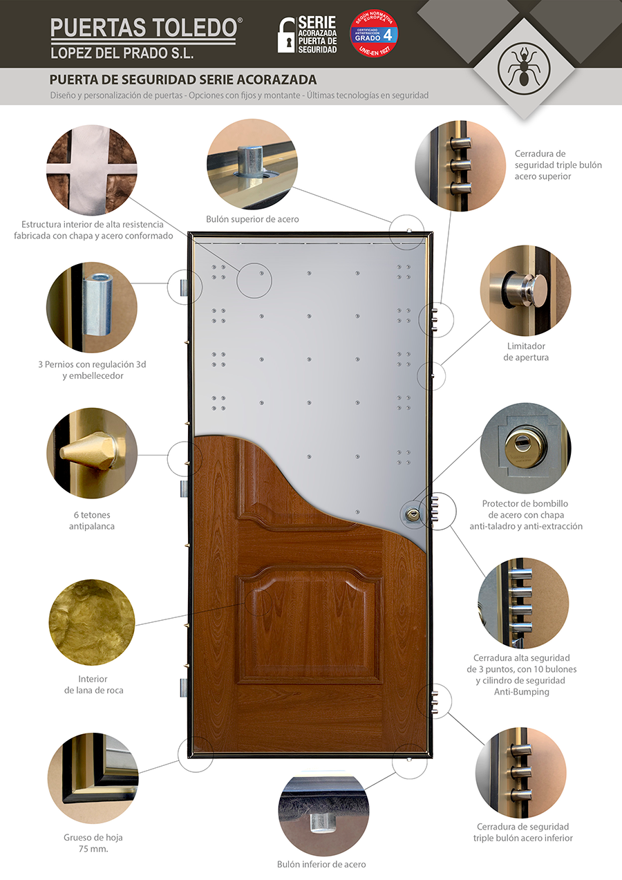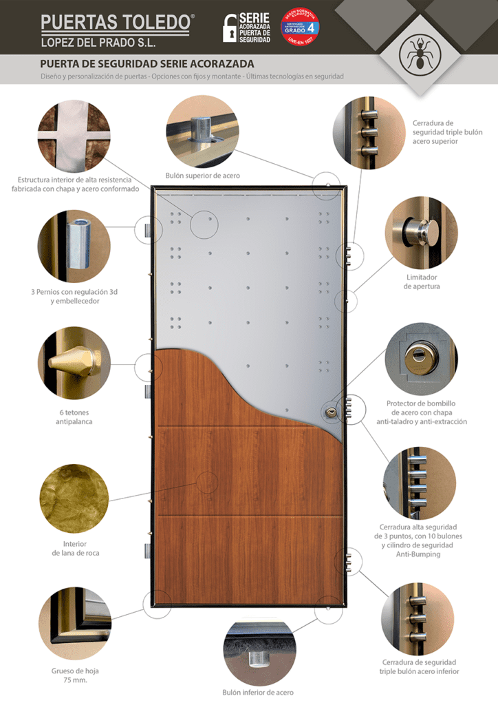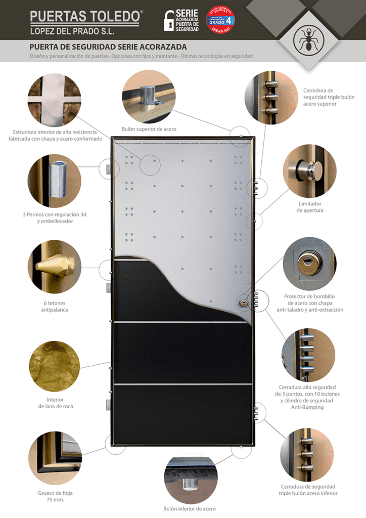 Una puerta acorazada grado 4, de la marca PUERTAS TOLEDO, consiste en una puerta reforzada capaz de repeler cualquier tipo de ataque. Se compone de una estructura de omegas y refuerzos en chapa conformada, fabricada a partir de materiales resistentes como el acero, con un sistema de anclajes y bisagras lo suficientemente resistente para que no se puedan extraer. Además, su fuerte peso complica aún más esta operación. Finalmente, el acabado exterior en aluminio o madera, proporciona una estética adecuada y personalizada para cualquier vivienda.