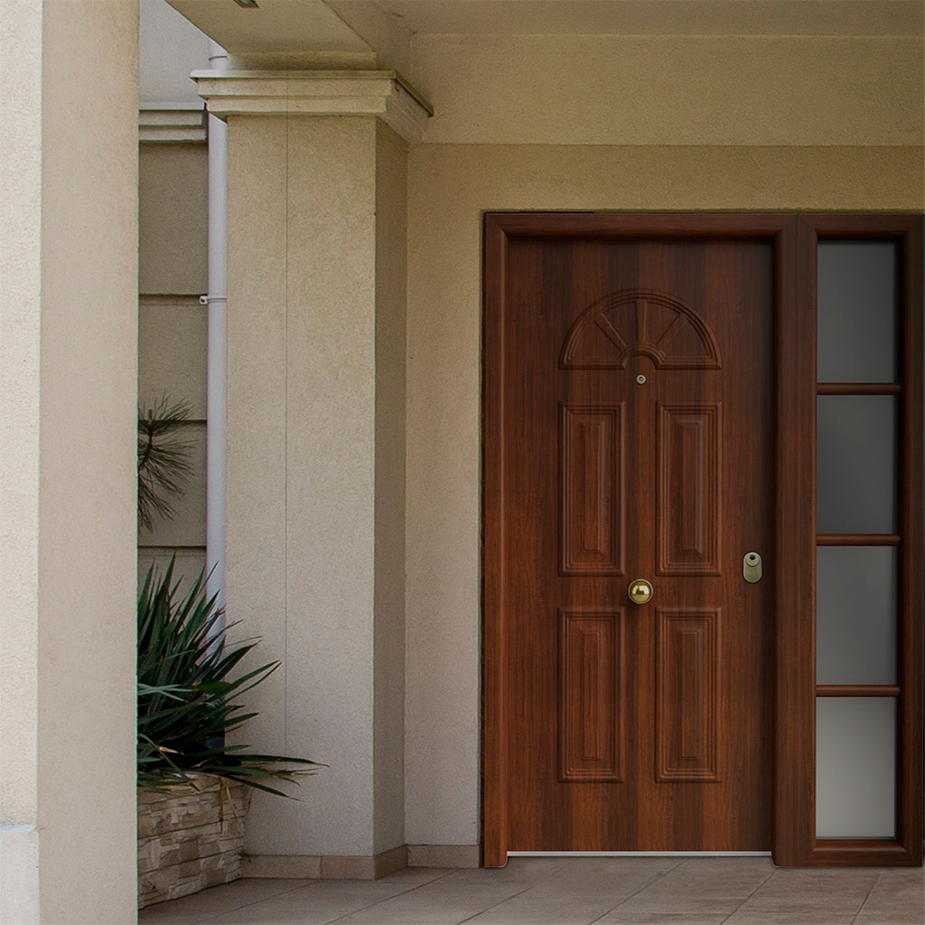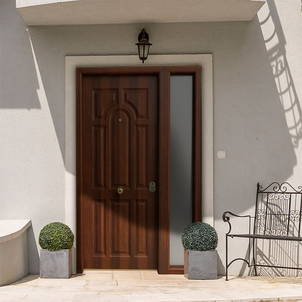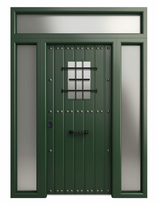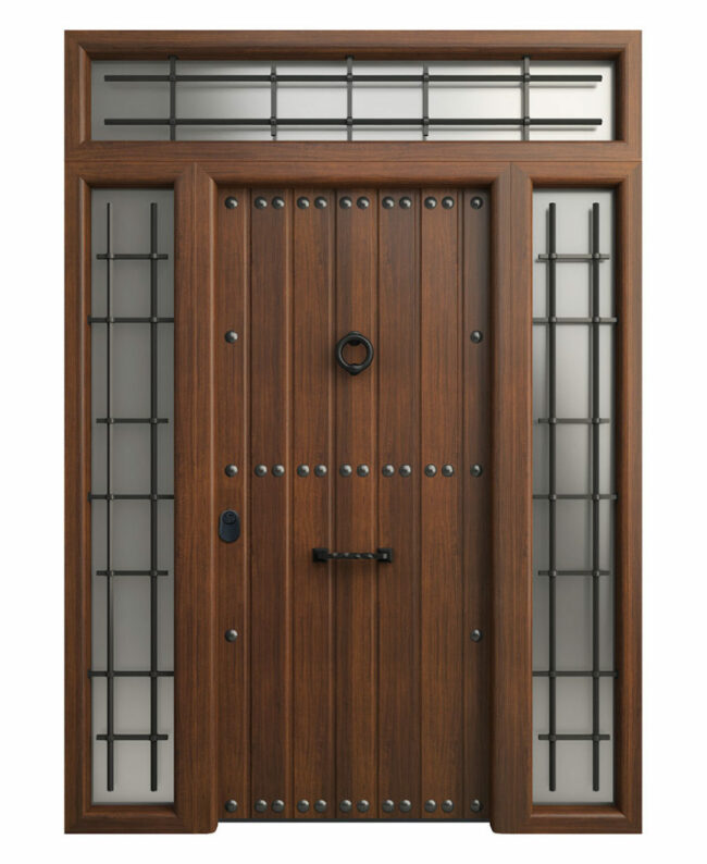 ACCEDE DESDE ESTE BOTÓN AL CONFIGURADOR VIRTUAL – DISEÑA TU PUERTA A MEDIDA Modelo 104 Gama Rústica Puerta de seguridad en aluminio, Modelo 104, 2 fijos laterales modelos 504 y 1 montante superior modelo 502. Tirador mod. M04 Patinado y Llamador aro M12 Patinado.. Lacada en Nogal Rojo, especial para su exposición a la intemperie.…