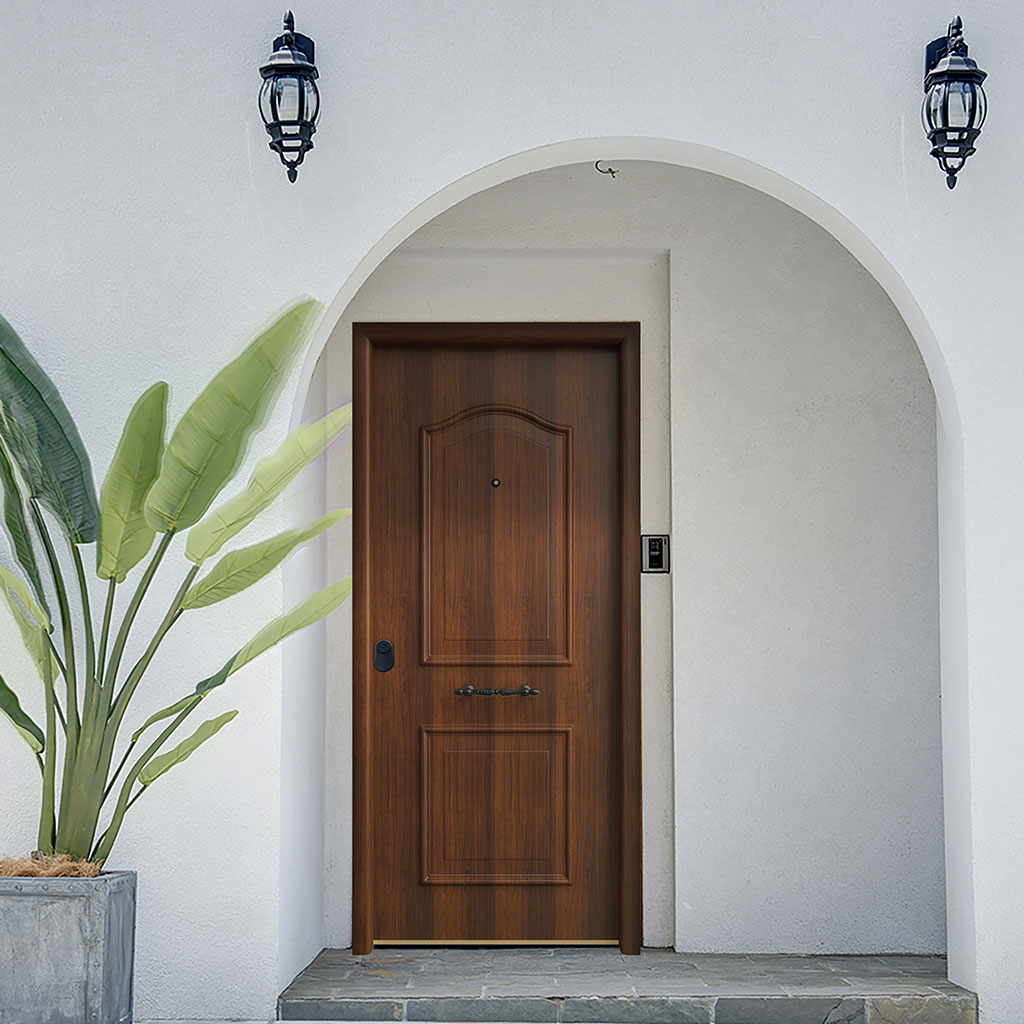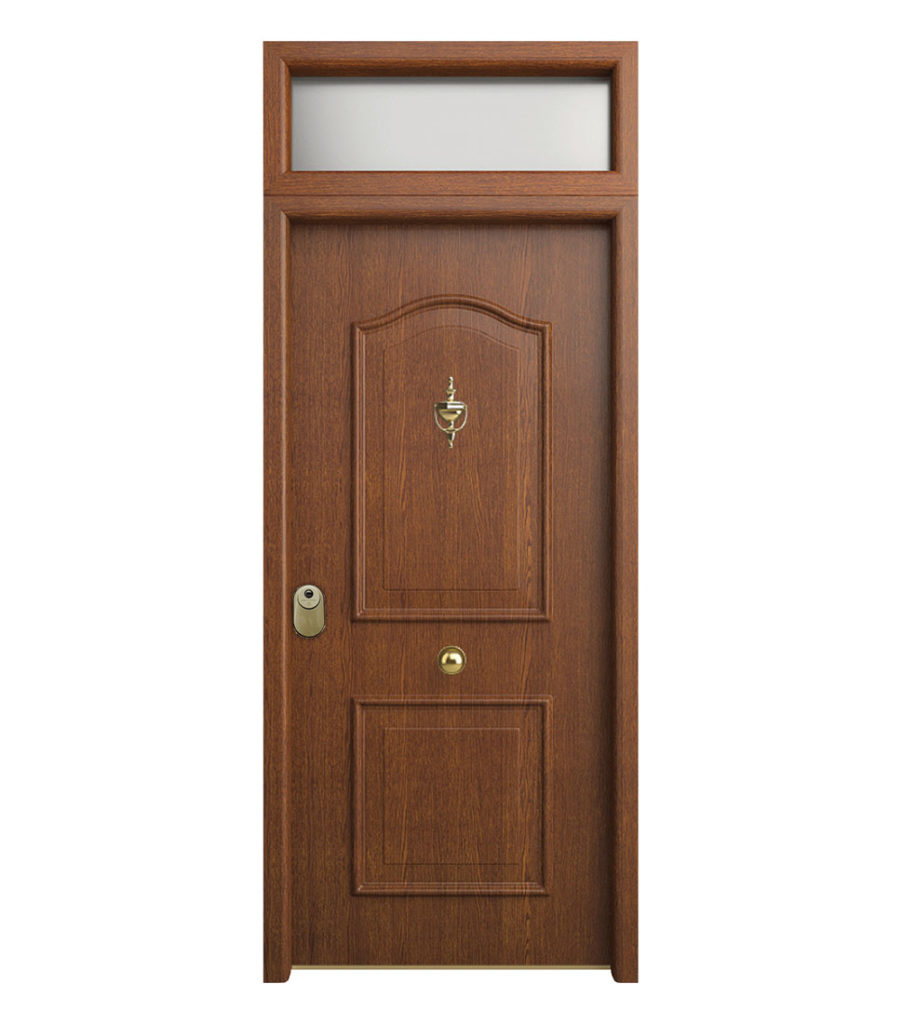 Puerta de seguridad en aluminio, Modelo 101. Tirador M-114 negro y mirilla negra. Lacada en Nogal Oscuro, especial para su exposición a la intemperie.