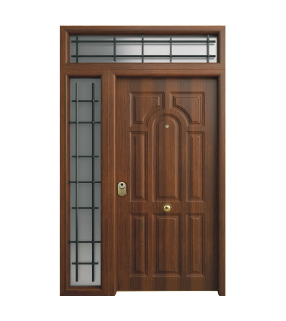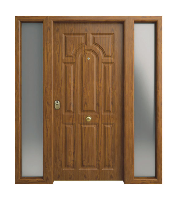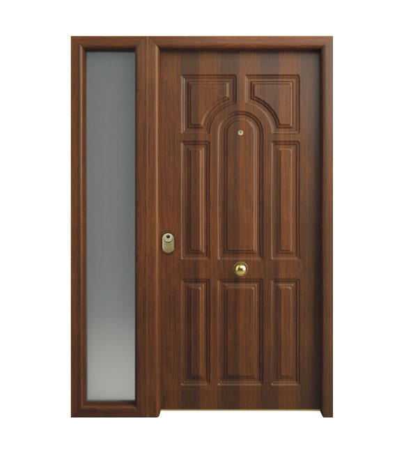 Puerta de seguridad en aluminio, Modelo 102. Con fijo lateral modelo 501. Pomo M09 dorado y mirilla dorada. Lacada en Nogal Oscuro, especial para su exposición a la intemperie.