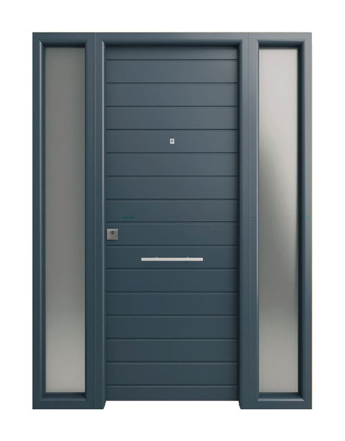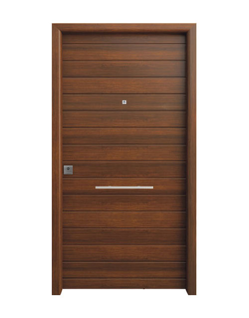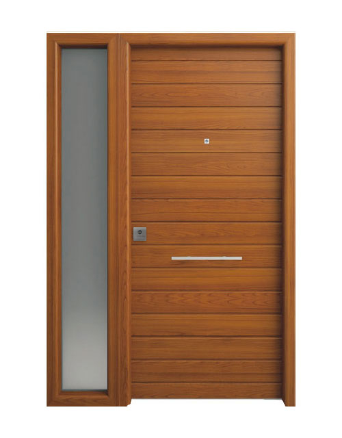 Puerta de seguridad en aluminio, Modelo 107, 1 fijo lateral modelo 501. Tirador Inox M-14 Lacada en Madera Nogal Rojo, especial para su exposición a la intemperie.
