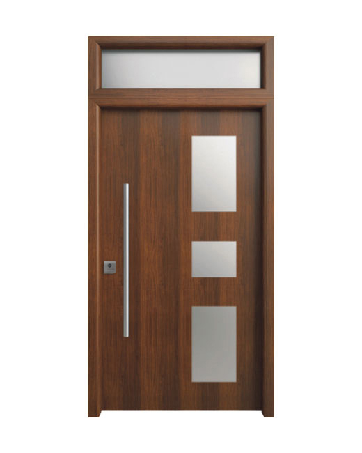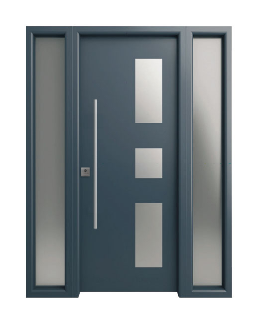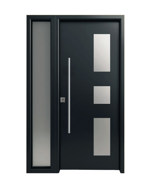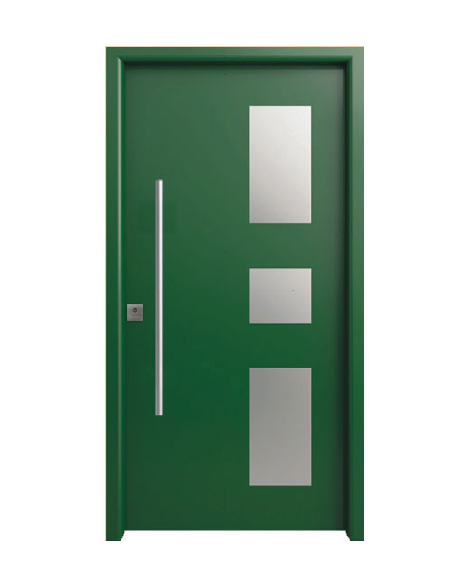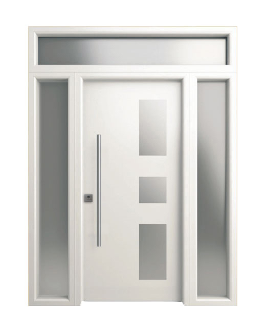Puerta de seguridad en aluminio, Modelo 109, 1 fijo lateral modelo 501. Detalles decorativos de acero inox. y tirador redondo Inox. ET-01. Lacado blanco, especial para su exposición a la intemperie.