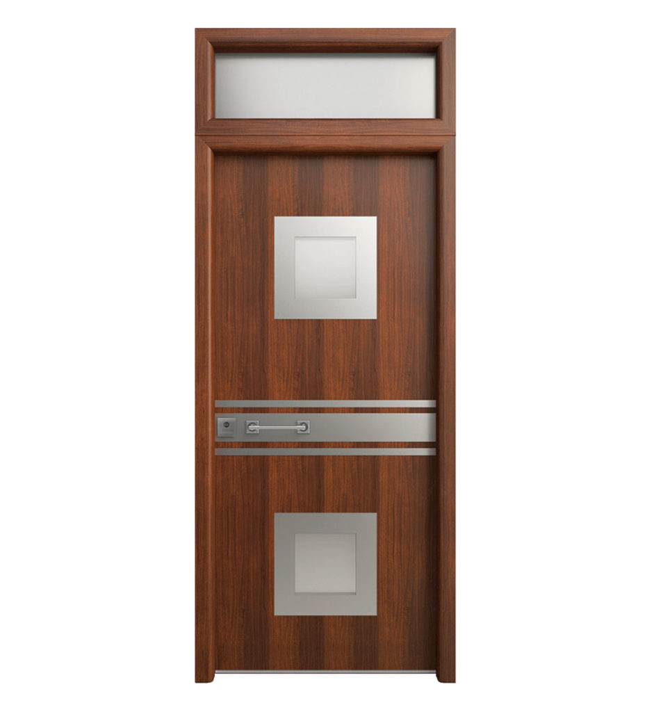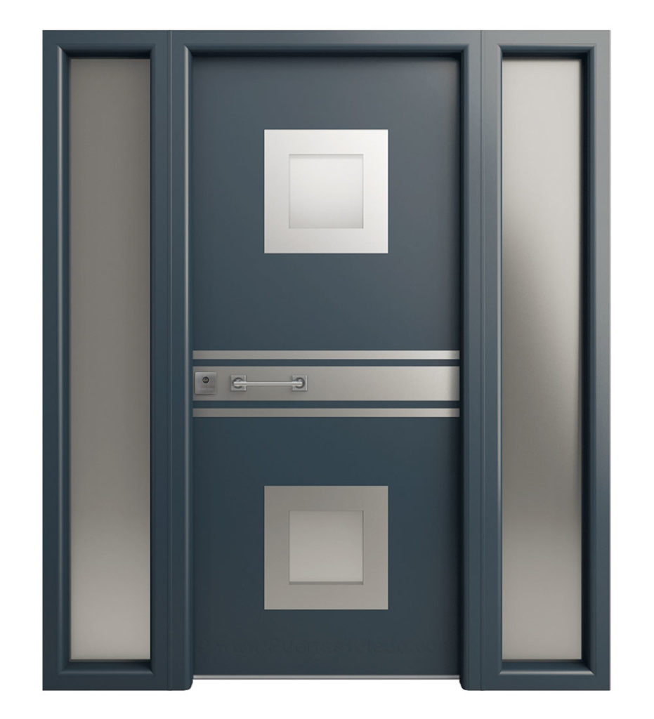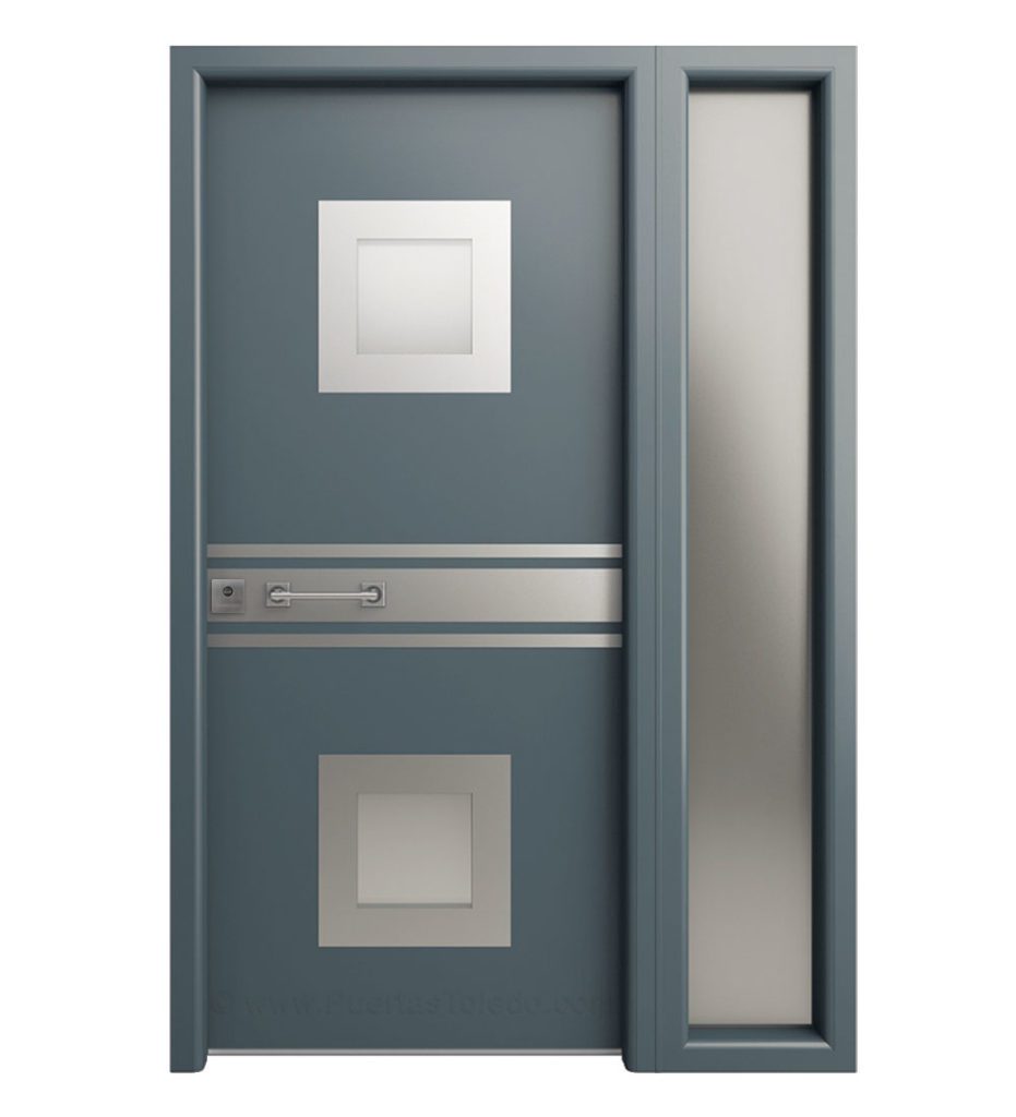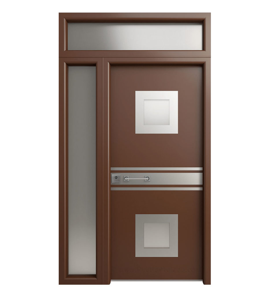 Puerta de seguridad en aluminio, Modelo 111. Detalles de acero inox. y cristales de seguridad mate. Tirador redondo Inox. ET-01. Lacado nogal oscuro, especial para su exposición a la intemperie.