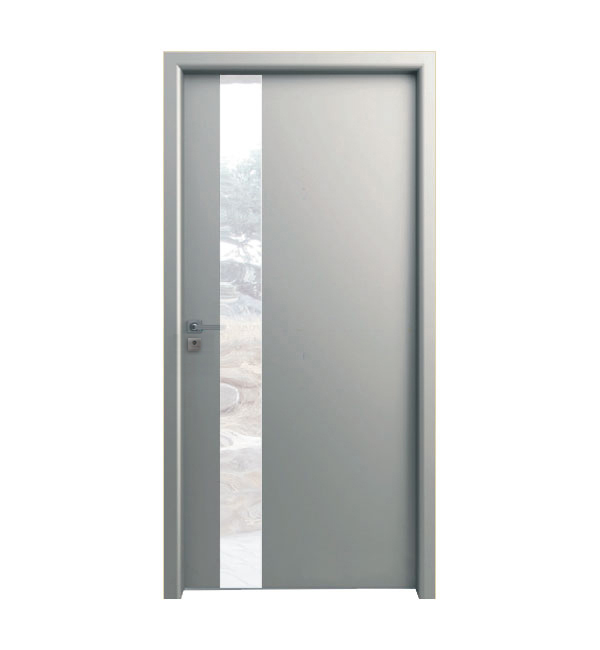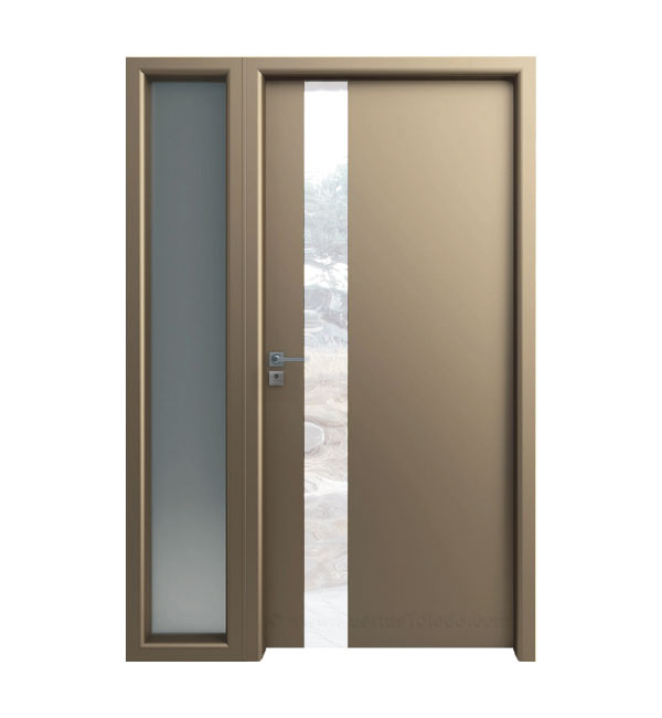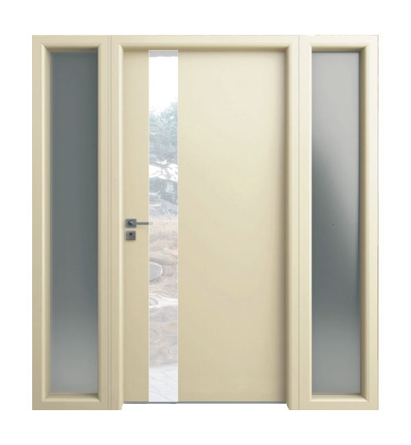 Puerta de seguridad en aluminio, Modelo 118. Detalles decorativos aluminio extra pulido, efecto espejo (reposicionable). Tirador redondo Inox. ET-01. Lacada blanco, especial para su exposición a la intemperie.