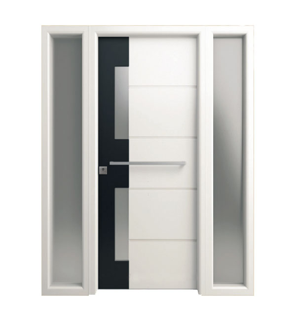 Puerta de seguridad en aluminio, Modelo 205 con cristal de seguridad, 2 fijos laterales modelos 501 y 1 montante superior modelo 502. Tirador inox HPT-600. Lacada en blanco, especial para su exposición a la intemperie.