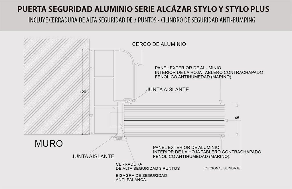 La serie Alcázar, se fabrica con interior de la hoja, tablero marino contra-chapado maciza y acero conformado.
