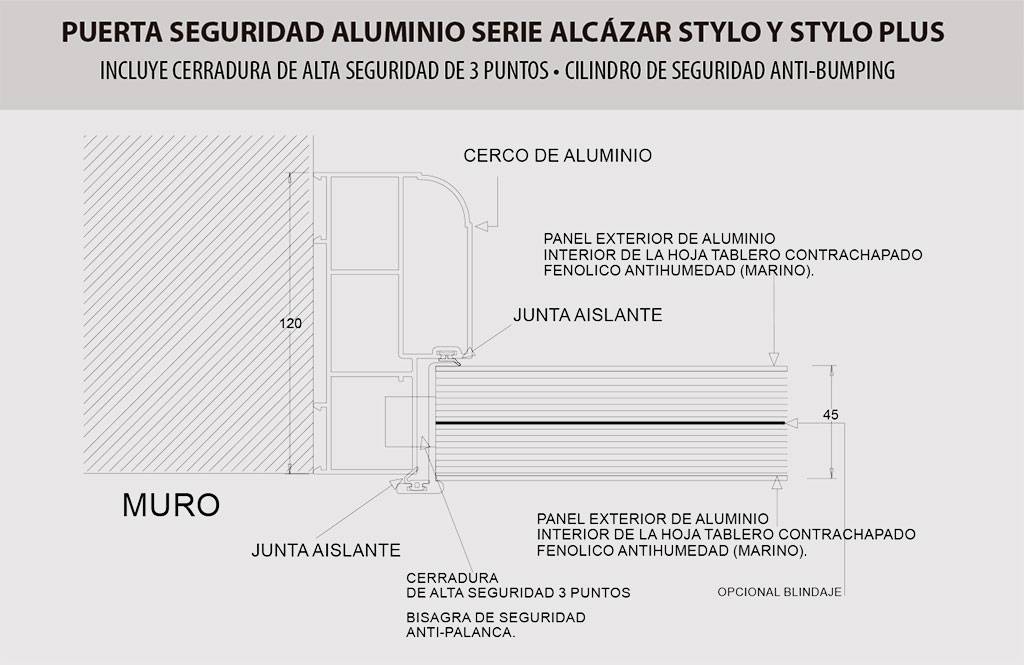 Todas las puertas incluyen de serie cilindro de seguridad anti-bumping, antiganzua y escudo de seguridad de protección anti-taladro y anti-extracción.